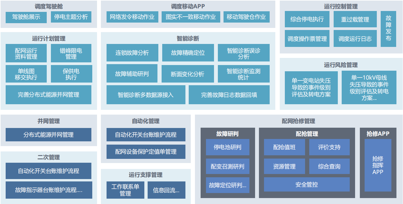 數(shù)字配電網(wǎng)管理解決方案, 是集調(diào)度生產(chǎn) 、專業(yè)管理和調(diào)度業(yè)務(wù)處理為一體化的調(diào)度運(yùn)行管理支撐平臺(tái) , 實(shí)現(xiàn)配網(wǎng)調(diào)度業(yè)務(wù)全范圍 、全過程 、智能化管理 , 業(yè)務(wù)功能上覆蓋運(yùn)行計(jì)劃管理 、運(yùn)行控制管理 、故障智能診斷、運(yùn)行風(fēng)險(xiǎn)管理、并網(wǎng)管理、二次管理、自動(dòng)化管理、 運(yùn)行支持管理、調(diào)度移動(dòng)APP 、配網(wǎng)搶修管理、調(diào)度駕駛艙等11項(xiàng)功能大類。 平臺(tái)以信息化建設(shè)為支撐 , 促進(jìn)各專業(yè)的管理標(biāo)準(zhǔn)化、 操作規(guī)范化 、流程一體化建設(shè) , 實(shí)現(xiàn)了三個(gè)職能 (配網(wǎng) 調(diào)度、系統(tǒng)分析 、快速復(fù)電故障指揮) 、兩個(gè)服務(wù) (為客戶服務(wù)、為縣,/區(qū)局和供電所服務(wù)) 的工作目標(biāo)。應(yīng)用場(chǎng)景