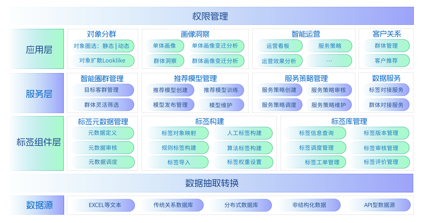 支持多種標(biāo)簽的一站式構(gòu)建方式,人機(jī)協(xié)同完成客戶360°標(biāo)簽體系;并對外提供多種方式的標(biāo)簽、畫像、用戶&業(yè)務(wù)數(shù)據(jù)的數(shù)據(jù)共享服務(wù)。