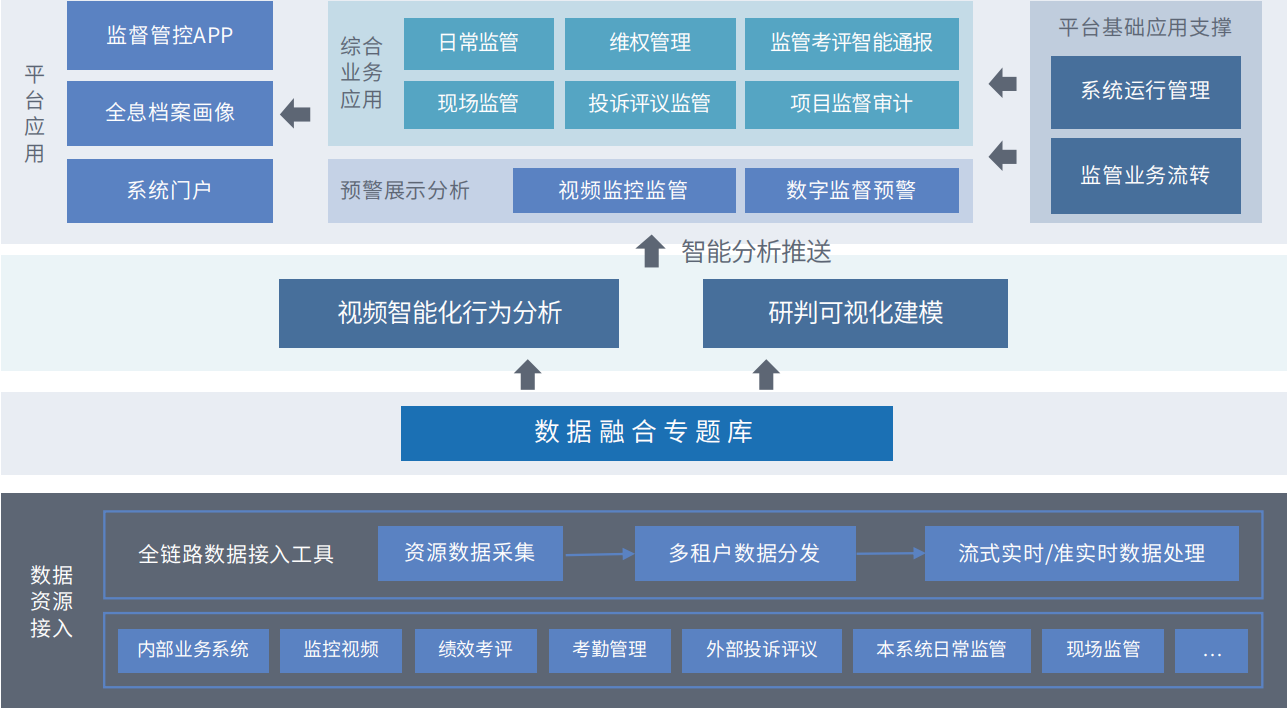 大監(jiān)督一體化管控平臺(tái)把“執(zhí)法監(jiān)督、依法行政、內(nèi)部監(jiān)督”的智能化監(jiān)督作為系統(tǒng)建設(shè)的主線,實(shí)現(xiàn)檢測(cè)預(yù)防、提醒自糾、 分析研判、線索倒查和責(zé)任追究,從而全面提升監(jiān)督效能。
