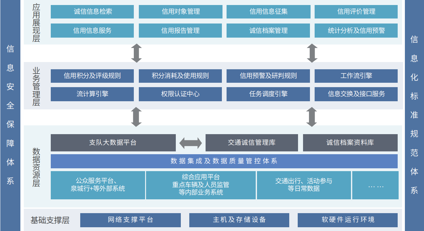 交通管理誠(chéng)信平臺(tái)以自然人、車(chē)輛、法人等征信基本對(duì)象為核心, 構(gòu)建360度誠(chéng)信對(duì)象模型。抽取各類(lèi)相關(guān)信用信息到相應(yīng)對(duì)象模型,將交通違法信息及不文明交通行為等納入交通誠(chéng)信檔案,形成一種“誠(chéng)信受益、失信受戒”的交通安全管理機(jī)制??蔀橥獠啃庞帽O(jiān)管相關(guān)部門(mén)提供基礎(chǔ)數(shù)據(jù)支撐,為響應(yīng)全國(guó)社會(huì)信用體系建設(shè)提供保障。平臺(tái)主要包括交通誠(chéng)信畫(huà)像(誠(chéng)信信息檢索引擎)、信用對(duì)象管理、信用信息征集、信用評(píng)價(jià)管理、信用信息服務(wù)、信用報(bào)告管理、誠(chéng)信檔案管理、統(tǒng)計(jì)分析及交通誠(chéng)信預(yù)警、組織及用戶管理等。